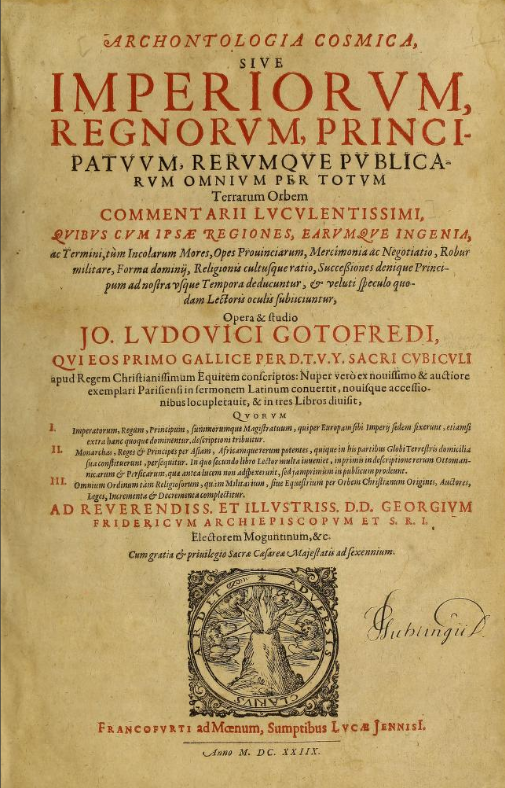 Archontologia Cosmica, sive Imperiorum, Regnorum, Principatuum, Rerumque Publicarum omnium per totum Terrarum Orbem commentarii luculentissimi, quibus cum ipsae regiones earumque ingenia ac termini, tum incolumum mores, opes, provinciae, merciumque & negotiationis, robor militaris, forma dominii, religio cultusque ratio, successiones denique principum ad nostra usque tempora deducuntur