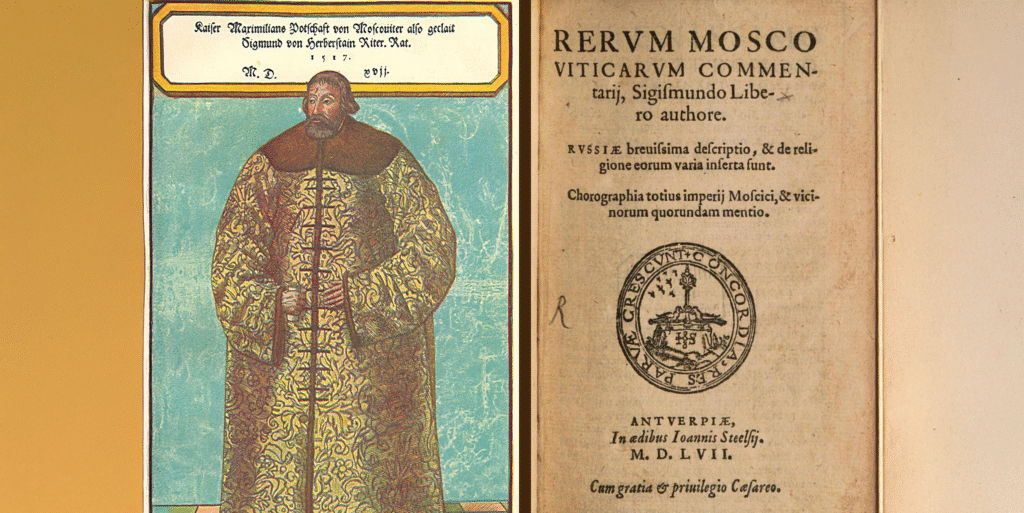 [«Комментарии о Московии, автором которых является барон Сигизмунд фон Герберштейн. Содержит краткое описание России, различные сведения о её вероисповедании, а также хоровую карту всего Московского царства и упоминания о некоторых соседних землях»].