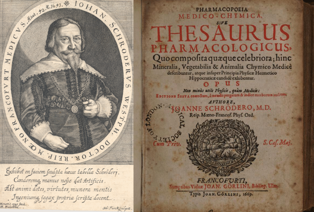 Pharmacopoeia Medico-Chymica, sive Thesaurus Pharmacologicus…, Франкфурт: Sumptibus Viduae Joan. Görlini, Bibliop. Ulm; Typis Joan. Görlini, 1669. 【5】